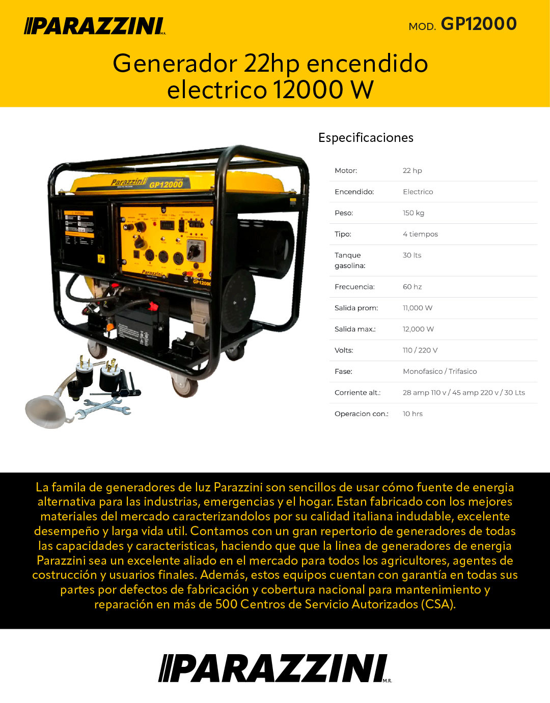 La famila de generadores de luz Parazzini son sencillos de usar cómo fuente de energia alternativa para las industrias, emergencias y el hogar. Estan fabricado con los mejores materiales del mercado caracterizandolos por su calidad italiana indudable, excelente desempeño y larga vida util.